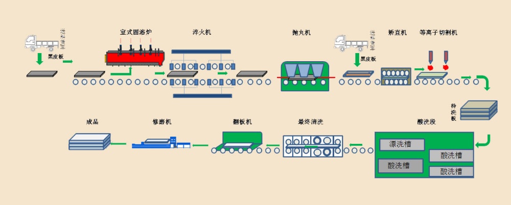 ![]() | 退火酸洗中板線主要有室式固熔爐,全自動(dòng)中板淬火機(jī)組,拋丸機(jī),矯直機(jī),酸洗池等設(shè)備,可實(shí)現(xiàn)最寬3200mm,最厚90mm中板的退火酸洗。 |